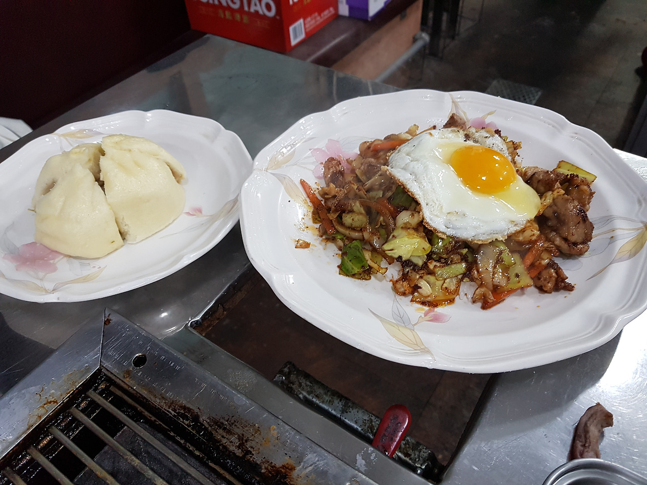 나의 개인적인 취향으론 이 덮밥이 제일 맛있다. 덮밥만 한 다섯개 주문해서 소주와 먹고 싶다. 옆의 고기만두는 사장님의 서비스.
