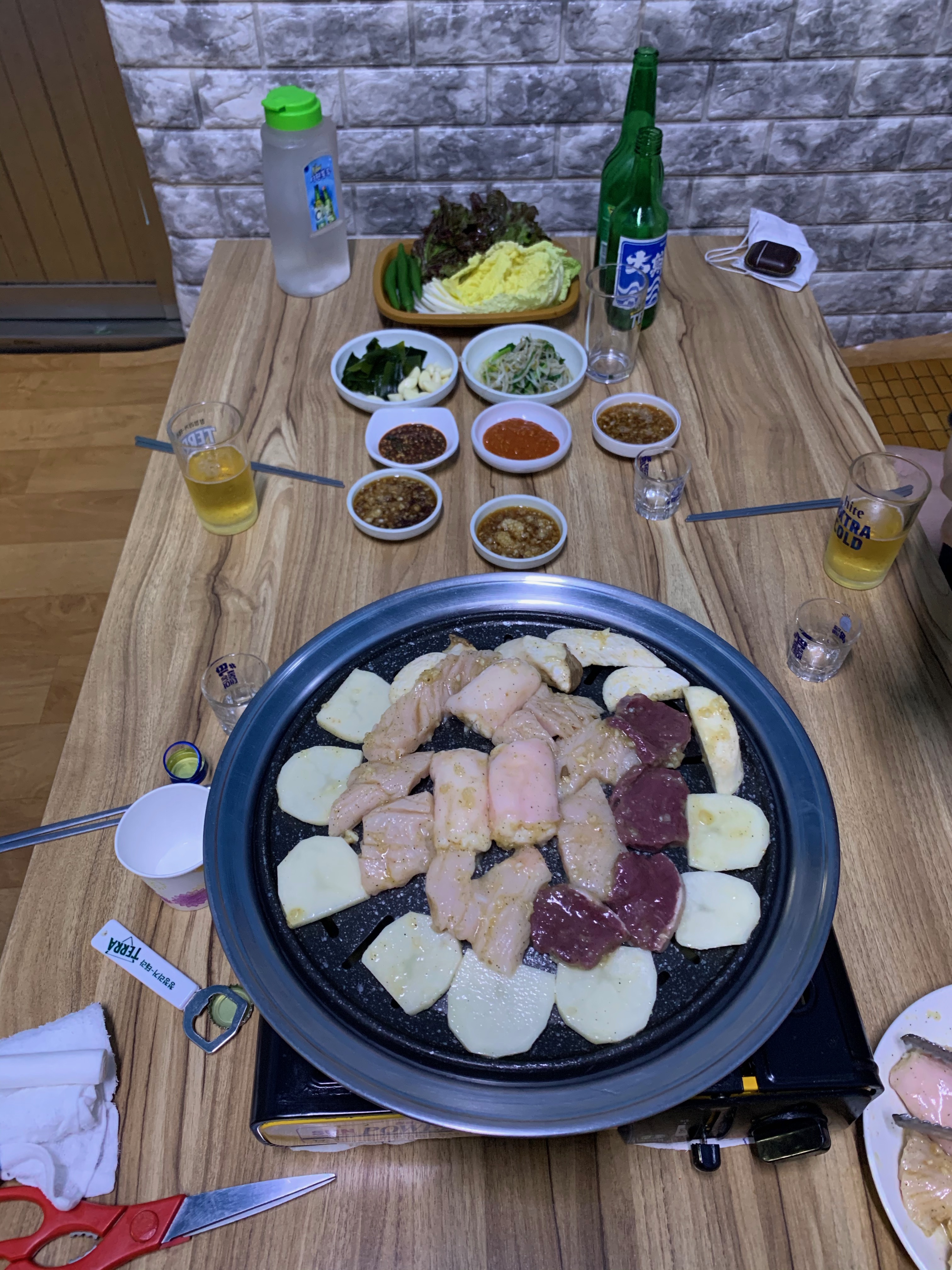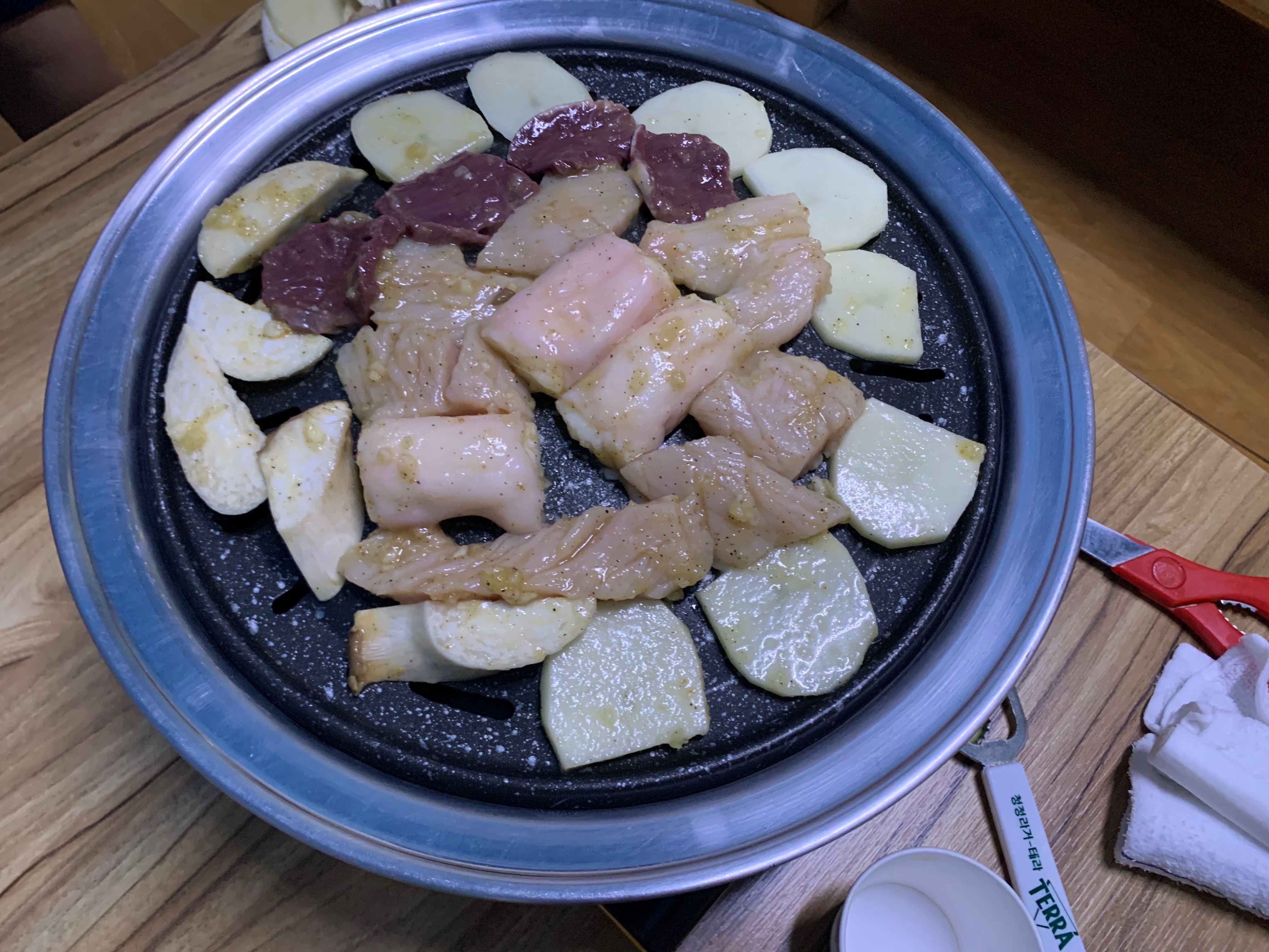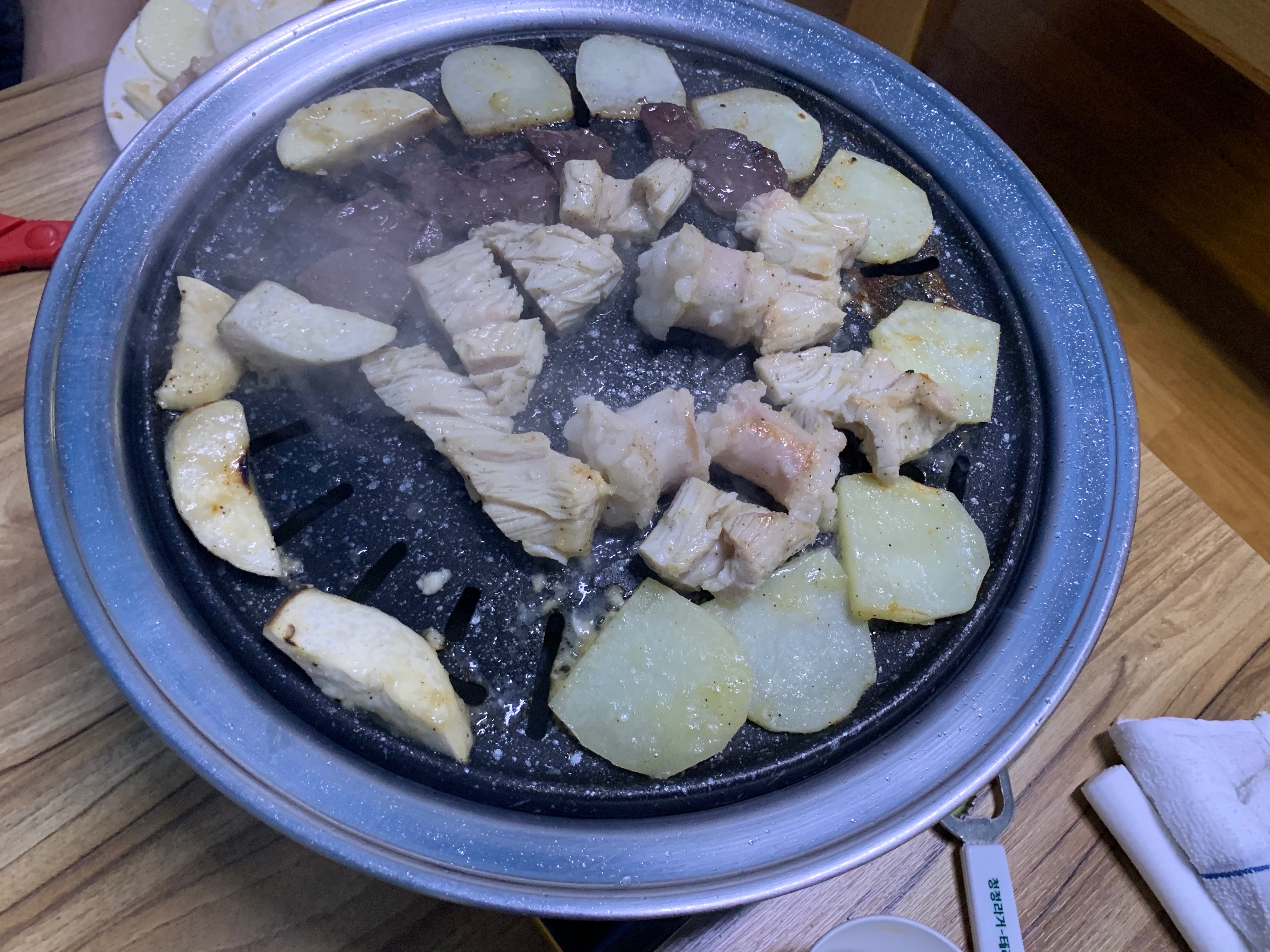 3인분을 주문하고 사장님이 절반 정도를 올려준 양이다. 즉 3인분을 주문하면 2판 정도 구워먹을 수 있다.